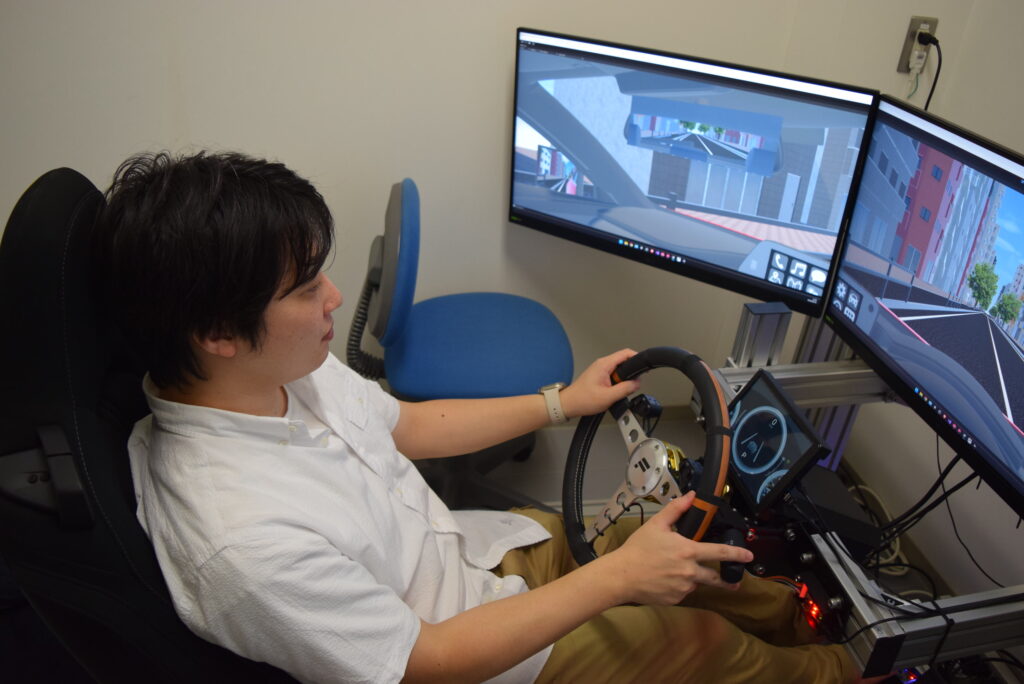 自動車産業は今、大きな転換期、発展の時期を迎えています。研究室では、ドライバー、乗員の観点から、自動車の研究を行っています。たとえば、ドライバー支援の問題があります。覚醒水準が落ちているドライバー、注意力が散漫になっているドライバー、高齢ドライバーに適切な支援をおこなうことで、事故を防止し、自動車を楽しむことができます。